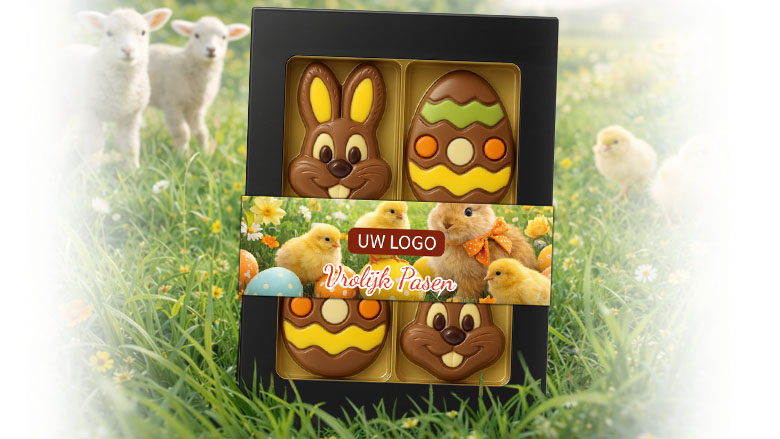 Origineel paasgeschenk met vier chocolade paasfiguurtjes in frisse lentekleuren, te personaliseren met logo of tekst via eigen wikkel