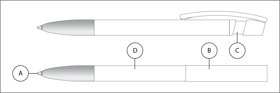 Kies je eigen pen kleuren: Je kunt ook zelf bepalen welke kleuren de pen krijgt. Zo kun je naast de kleur van de vulling (A), ook bij de clip (B) kiezen uit maar liefst 18 verschillende kleuren, waaronder geel, paars, groen, oranje, zwart en wit. Bij het bovenstuk (C) kun je kiezen uit 19 kleuren, zoals o.a. zilver, donkerblauw, geel en oranje. En tenslotte kun je ook bij de houder (D) nog je eigen kleur kiezen. Daar kun je o.a. kiezen uit: mat wit, mat rood, mat groen, frosted oranje, frosted groen, frosted geel. Wil je alle kleuren weten waar je uit kunt kiezen? Neem dan contact op voor de mogelijkheden.