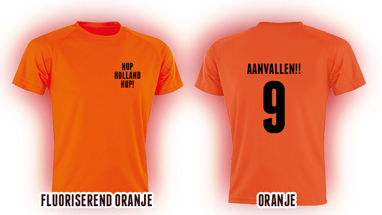 Lichtgewicht en ademende oranje WK voetbal T-shirts met bedrukking. In fluoriserend of standaard oranje